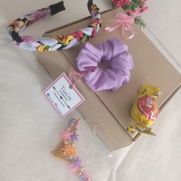 Box Lila. Vincha + scrunchie + sujeta barbijos